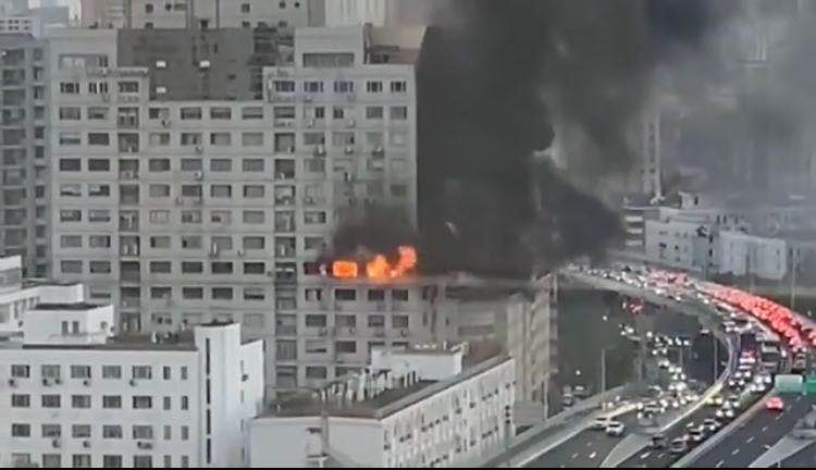 2020-10-14今天16时44分,虹口区甘河路近中山北一路明道大厦发生火灾。据目击者拍摄的现场视频显示,起火位于大楼中部,紧邻内环高架,现场火势较大,浓烟滚滚而出。