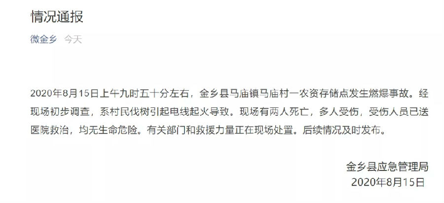 2020-08-188月15日9时30分左右 山东省金乡县一商贸市场附近发生燃爆事故 目前事故已造成2人死亡多人受伤 伤者已被送进医院救治 无生命危险 现场处置仍在继续