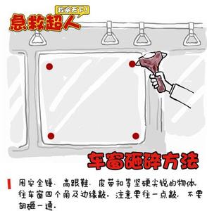 配有安全锤的空调客车,可把小锤从架上取下,用尖的一头朝玻璃中部敲下去,玻璃呈放射状裂开后用鞋底猛踢一下,玻璃就碎了。万一找不到安全锤,如用重物或皮带扣猛击玻璃,或者用女同志的高跟鞋击打空调车钢化玻璃的四周,等出现裂痕后,再用脚底踢开,尽快破窗而出;