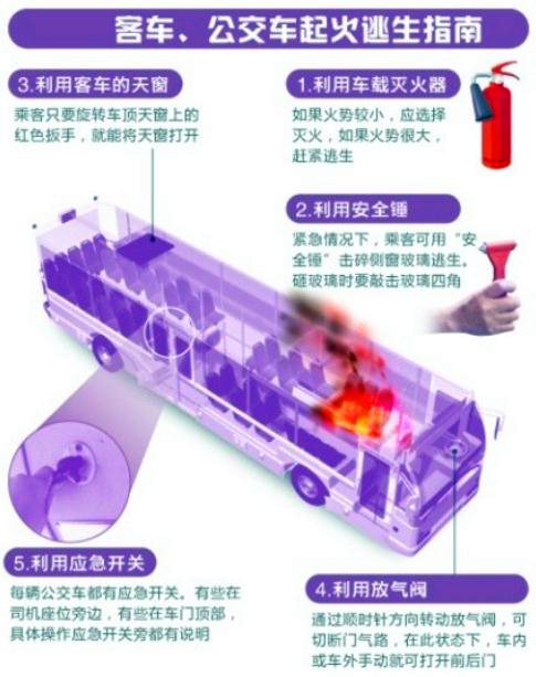 乘客只要旋转车顶天窗上的红色扳手,就能将天窗打开,从而迅速逃生。同时,大部分空调客车都在车厢后部设置了逃生门和逃生气窗,坐在车厢后部的乘客可就近迅速打开着两个通道逃生。