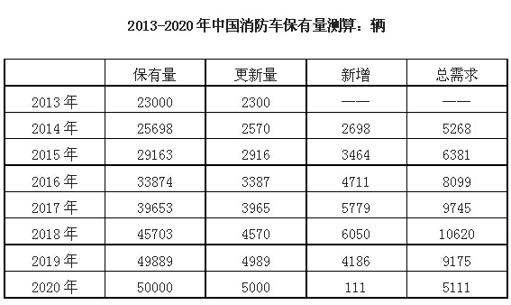 粗略估算我国消防车的保有量应该在5万辆左右。那么预计2016年需求量将达到8100台。而中高端产品普遍价格在100万-400万之间,按照单台价格200万计算,则2016需求规模有望达到162亿。