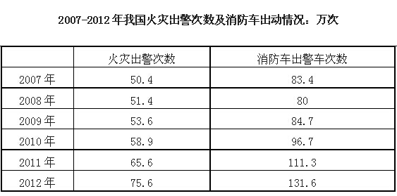 2011年全国公安消防部队共接警出动65.6万起,比上年增长6.7万起,是建国以来出警次数最多一年。其中火灾扑救12.5万起,抢险救援20.9万起,挽回经济损失660亿元。消防车出警次数首次超过百万次达到111万次,较2010年增长15%。