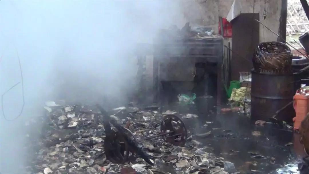 着火,现场浓烟弥漫,屋顶已经被烧穿,据询问当事人得知,着火房间当时在熏烤腊肉,因