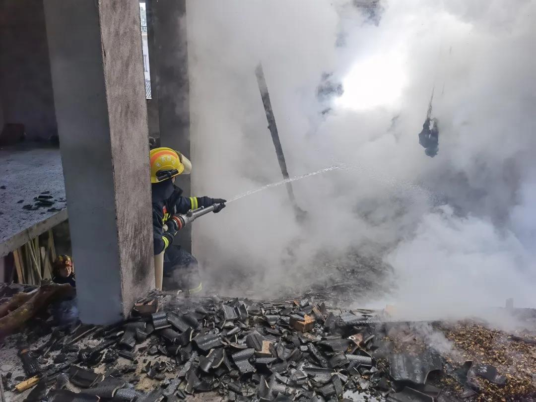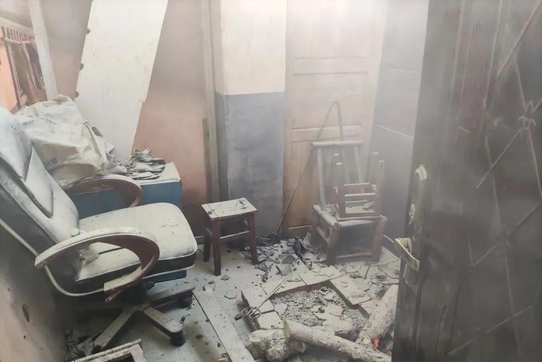 屋顶被烧穿,瓦片散落一地,墙壁出现多条裂缝。