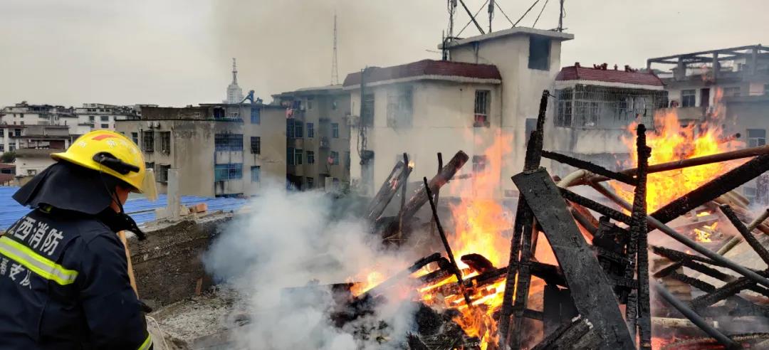 ,宜春市高士路一6层楼房房顶着火,据屋主描述,火灾是因为在楼顶熏腊肉,
