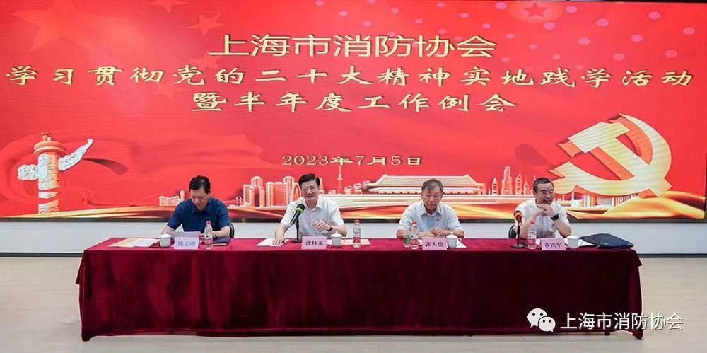 2023-07-077月5日,上海市消防协会在宝山区淞沪抗战纪念馆开展学习贯彻党的二十大精神实地践学活动暨半年度工作例会。市消防协会会长沈林龙主持例会并讲话。